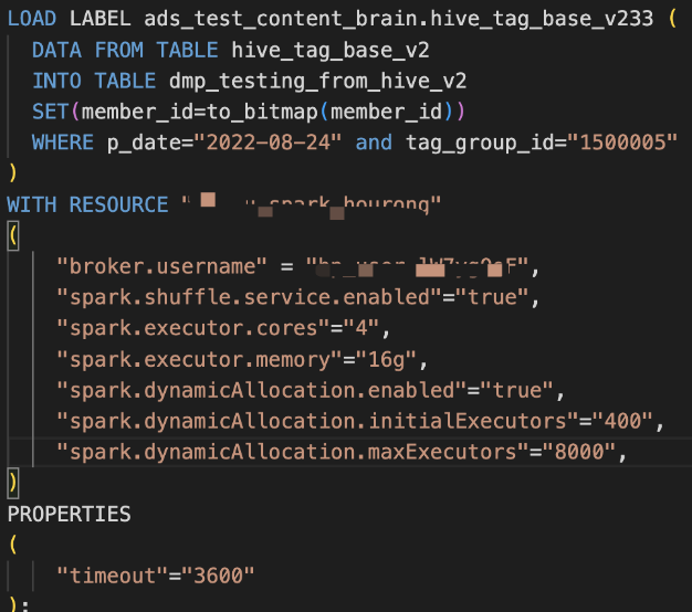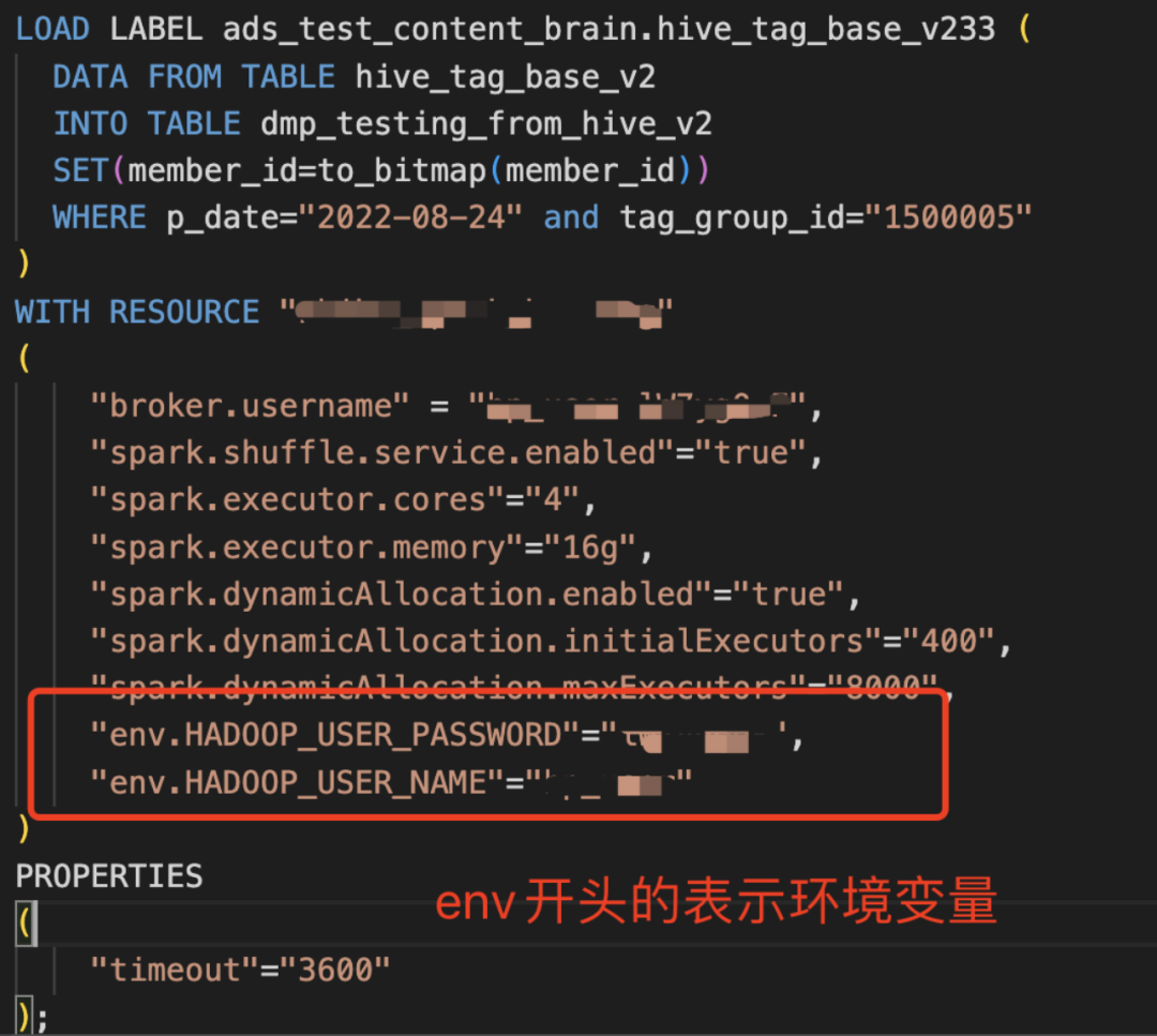 spark-submit在提交任务时候拿的是环境变量HADOOP_USER_NAME,HADOOP_USER_PASSWORD 作为用户名和密码,而我们的诉求是不同的任务要支持使用不同的账号来提交,所以我们为 spark-load 新增了动态设置环境变量的功能,相关pr也合入到了社区,之后我们把导入语句改成这样,问题得到解决。