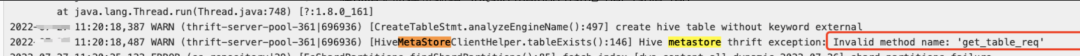 建hive表时提示报错 "Invalid method name:'get_table_req'"