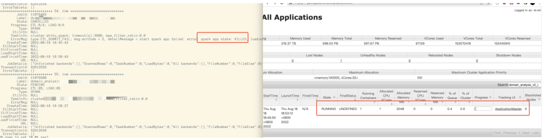 原因:任务提交到spark后,doris会通过yarn工具定期不断获取任务状态,如果持续5分钟任务还是处于accpeted状态则会自动kill