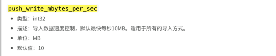 原因是BE默认有限速,默认单个BE最大导入速度为10MB,控制参数名push_write_mbytes_per_sec。