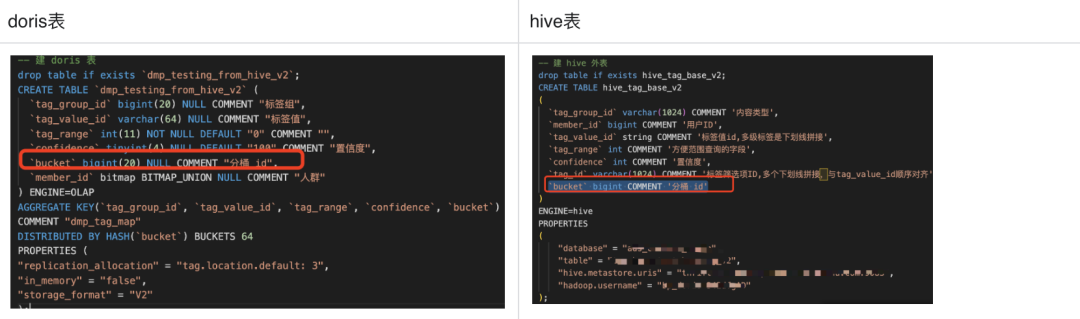 以导入 hive 表 hive_tag_base_v2 到 doris 中为例,来说明下整个导入过程中遇到的一些关键问题和解法,doris 表和 hive 表结构定义如下,聚合类型为 bitmap_union ,两个定义如下表