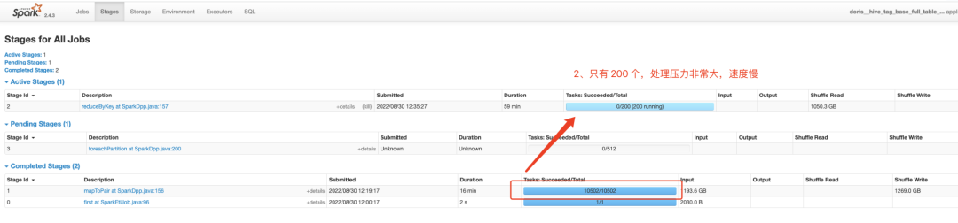 通过进一步分析,发现瓶颈是push任务少了,ETL 任务完成后,FE 获取 spark 预处理过的每个分片的数据路径,并调度相关的 BE 执行 Push 任务。默认这个任务数是 3个,调大到 9 后验证下
