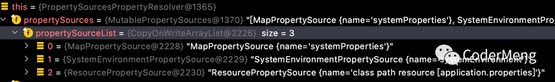 如下图所示,MutablePropertySources 中 0 和 1 是 Environment 创建的时候默认初始化的配,第二个是我们自己加的配置,这里我们也可以将我们自己加的配置放在最前面。MutablePropertySources 中有 addFirst 和 addLast 来控制添加的位置。