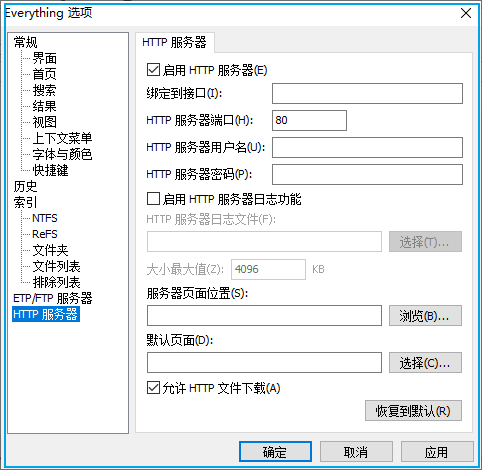 在 Everything 中打开 HTTP 服务器功能即可对外提供 Web 搜索服务。