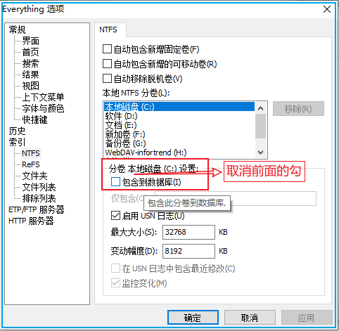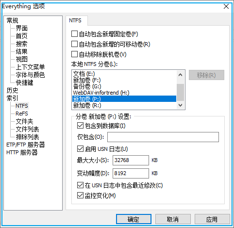 以上命令是将 R盘下的p目录映射到新的盘符P盘之下。此时将新的盘符P盘加入到数据库中,启用 NTFS 的 USN 日志功能,可以加快索引。