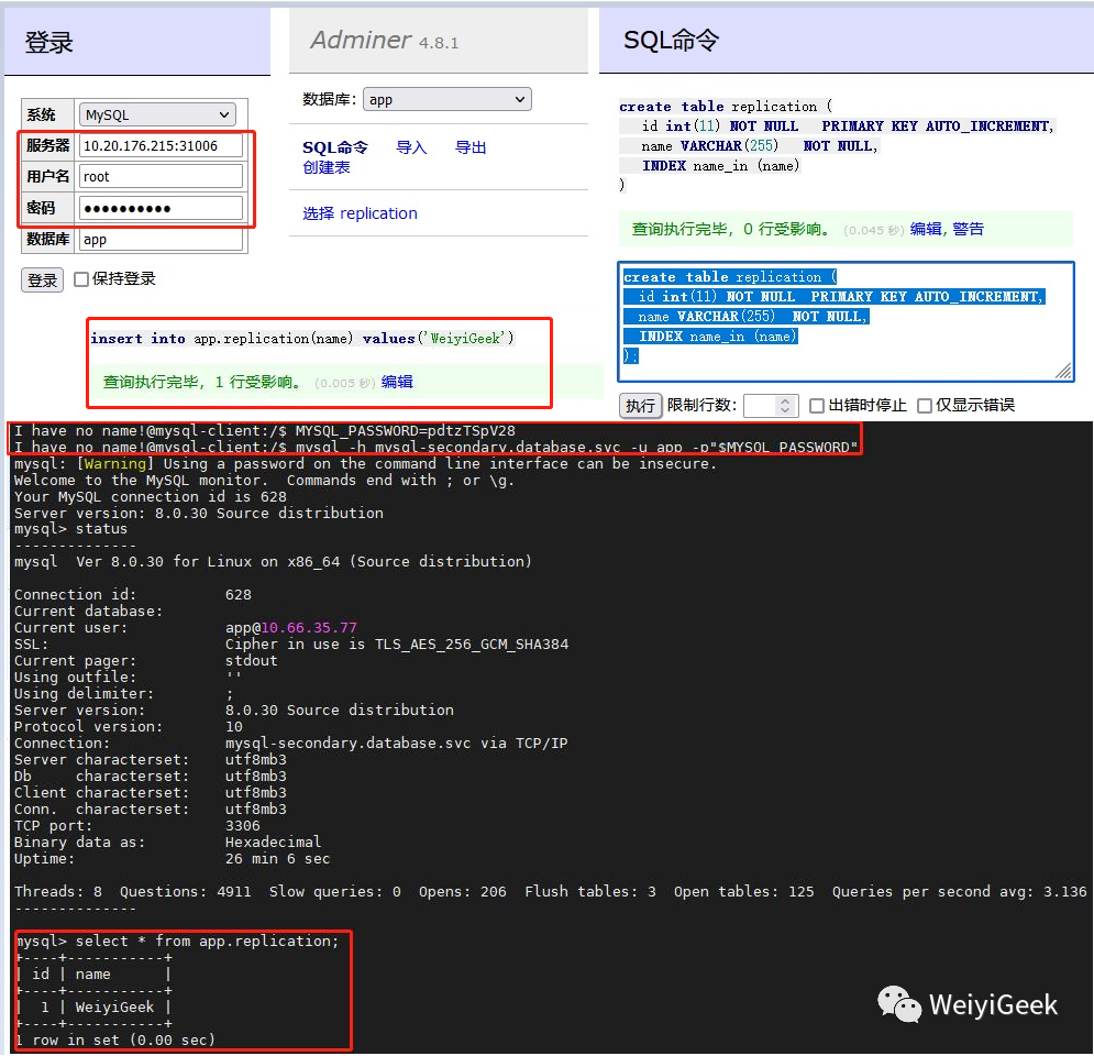 步骤 06.使用 Adminer 连接到主服务中进行读写,然后验证从节点的是否正确可读。