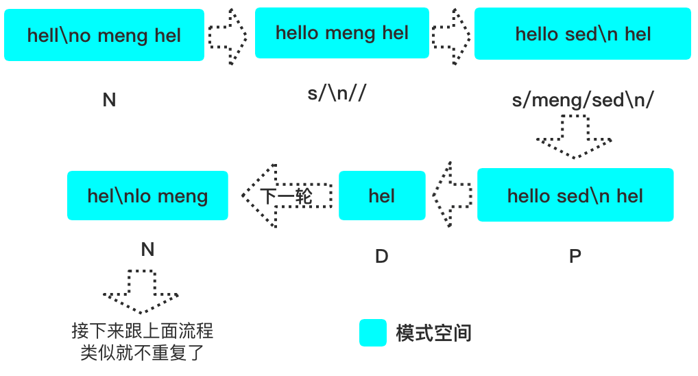 meng➜/tmp» cat f.loghello meng hello meng# 处理流程见下图meng➜/tmp» sed 'N;s/\n//;s/meng/sed\n/;P;D' f.loghello sedhello sed