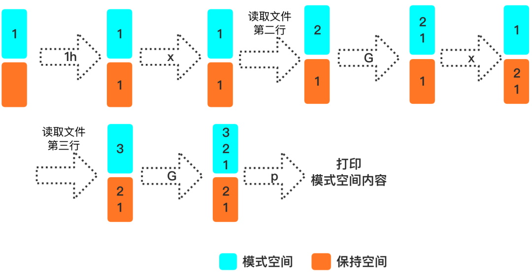 保持空间也是一块暂存区域,我们可以将模式空间的内容复制到保持空间,也可以将保持空间内容复制到模式空间,方便我们对多行进行操作。