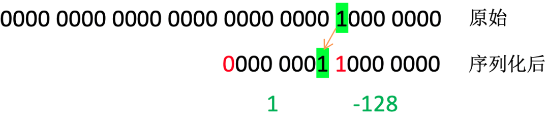 当我们给 a 赋值 128 的时候,输出的序列化后的字节数组: