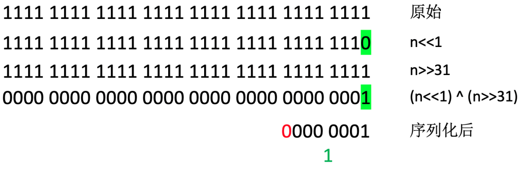 0000 0001,这里标志位是 0 表示到这里已经读取到所有数据了,跟前一个字节数据拼接在一起:
