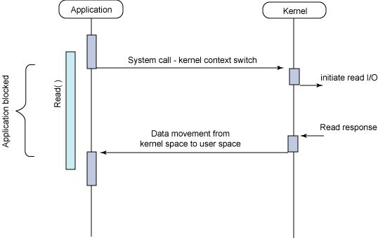如上图所示,当应用程序发送读取数据的请求,内核接收到请求开始读取数据,一直到数据读完(或者遇到错误)返回给应用程序,应用程序一直是阻塞的。