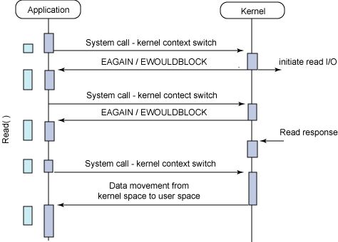 这种方式是非常低效的,应用程序要不断轮询,需要占用 CPU 资源。并且这个时候如果内核已经读取完数据,然后程序的下一次轮询还未开始,这就会造成时间的浪费,对系统吞吐量造成影响。