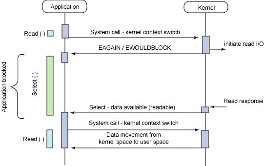 这里应用程序会将 socket 注册到 select 上,当应用程序调用 select 的时候就会被阻塞,而 Kernel 同时会监听 select 上的 socket 有数据可读 select 就会返回,然后程序读取数据。