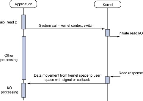 应用程序向内核请求读取数据,内核会立马告诉应用程序开始读取数据,然后应用程序可以处理其他事情。当内核读取完数据,并将数据 copy 到用户空间后,会通知应用程序数据已经读取完成。