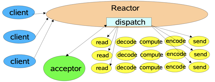 我们可采用分治的思想,将处理流程拆分成更小的任务,减少每个线程的阻塞时间,基于事件驱动 (异步阻塞 I/O)。