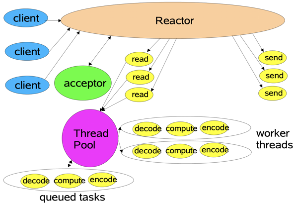 这里 Reactor 是单线程的,接收所有的客户端请求,连接请求分配给 acceptor,数据处理分配给处理的线程。