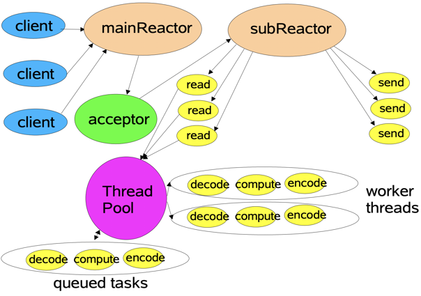 subReactor:负责读取发送数据,将请求分配给业务线程池。对应 Netty 中的 workerGroup。