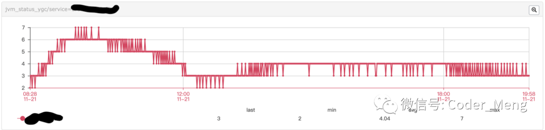 下图是每分钟yong gc 的次数,可以看出每分钟gc的频率比较稳定。