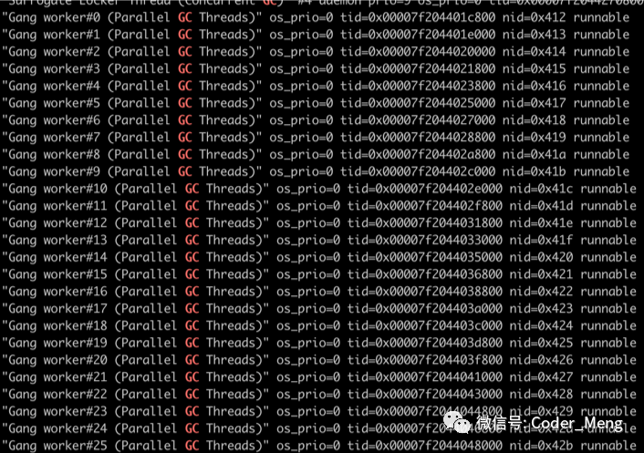 根据上面的猜测,通过 jstack 查看线程id,nid线程id,0x412对应10进制1042,后面连续的几个线程 id 都是 GC 线程。