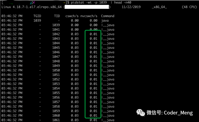 通过pidstat 查看进程下线程的上下文切换情况,自愿和非自愿切换都是非0。非自愿切换说明线程的时间片用完了,导致线程被迫进行了切换。