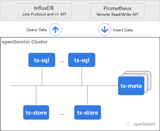 openGemini采用MPP 大规模并行处理分层架构,由ts-sql(计算引擎)、ts-store(存储引擎)、ts-meta(元数据引擎)三大部分组成。openGemini既支持集群部署,也可以单机部署。