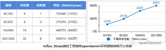 从4U的155万Metrics/s平稳增长到32U的560万Metrics/s