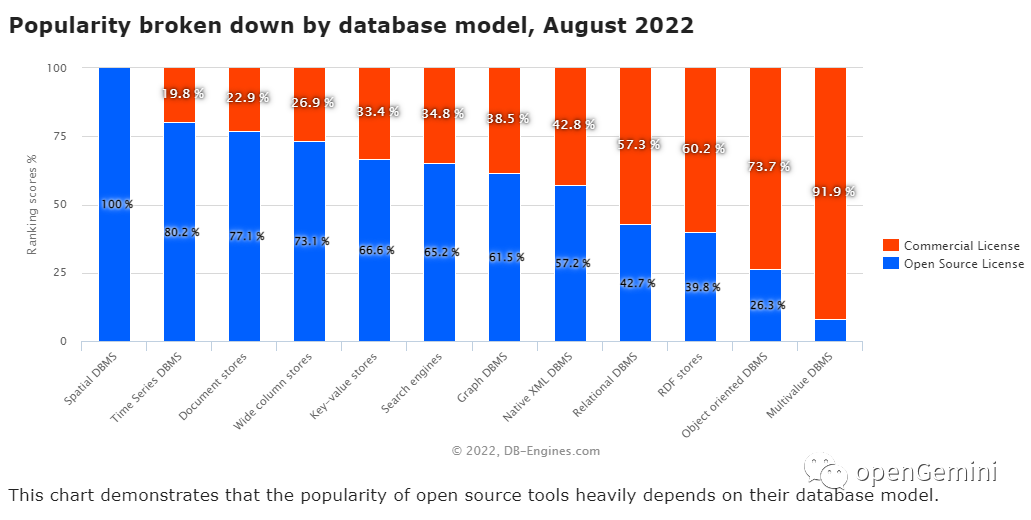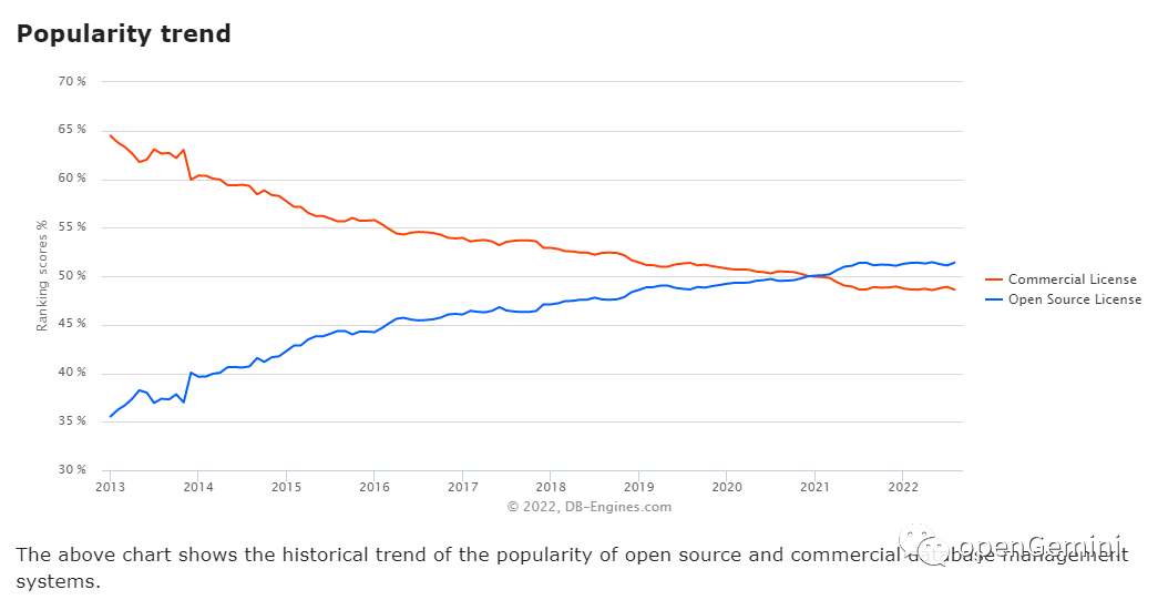开源是开放创新的有效手段,是数字时代的事实标准和专利。DB-Engines的统计数据表明,从 2021 年开始,开源数据库的流行指数已经超过商用数据库,开源时序数据库占比更是高达80%,openGemini时序数据库作为基础软件,也需要拥抱开源。
