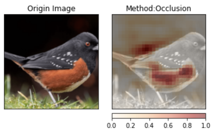 Towhee 集成了许多经典CNN网络的可解释性算法,例如 Occlusion, GradientShap, Saliency 等(更多可解释性算法原理可参考 captum[3] )。我们在这里选用预训练好的 resnet-18 模型,以一张鸟的图片( towhee.png[4] )为例,利用Towhee可视化工具展示图片中影响预测结果的部分。