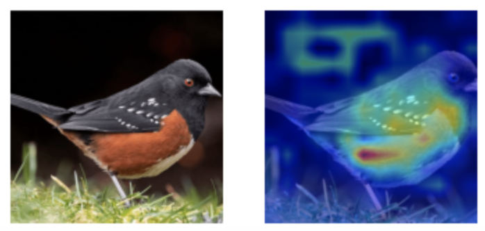 表明该预测结果的可信度很高。也就是说,在我们的这个例子中,CNN 模型是因为最终向量关注在图片中的鸟上面,才推理出该图片对应的标签为一种鸟类。
