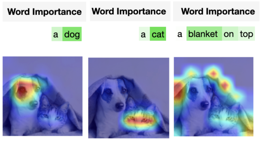 在可视化里,颜色越深表示该部分越重要。不难看出,在匹配“a dog”与该图片时,图片中狗的脸部特征和文本中“dog”一词起到了关键作用。同样在匹配“a cat”与该图片时,“cat“一词和图片中猫脸部分被高亮标出。而在匹配”a blanket on top“与该图片时,图中的小动物们不再强烈地影响相似度计算,图中的毯子取而代之与文本中“blanket”一起提高了最终的相似度。