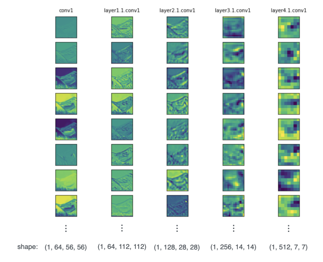 让我们用可视化工具观察和比较五个在不同深度的卷积层的输出:conv1、layer1.1.conv1、layer2.1.conv1、layer3.1.conv1、layer4.1.conv1。