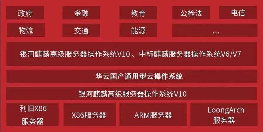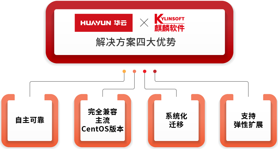 解决方案以银河麒麟高级服务器操作系统V10作为Host OS,辅以华云国产通用型云操作系统的虚拟化、存储、安全、云管等云计算模块功能,融合提供银河麒麟高级服务器操作系统V10、银河麒麟高级服务器操作系统V10(兼容版本)、中标麒麟服务器操作系统V6/V7等操作系统的虚拟机,同时借助于华云数据云迁移工具,满足政府、金融、教育、公检法、电信、物流、保险、证券等各行业现有CentOS系统一键升级至使用自主创新操作系统的云平台之上,助力企事业用户的网信信息化发展与建设。