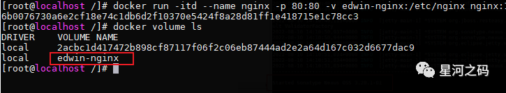 docker run -itd --name nginx -p 80:80 -v edwin-nginx:/etc/nginx nginx:1.19.3-alpine以上命令,没有宿主机目录位置,只有一个名字和一个容器的目录,edwin-nginx 就是数据卷的名字