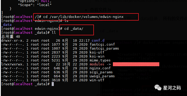 cd /var/lib/docker/volumes/edwin-nginx前文提到命名的数据卷和匿名数据卷的目录在docker管理下,一般是 /var/lib/docker/volumes/目录下