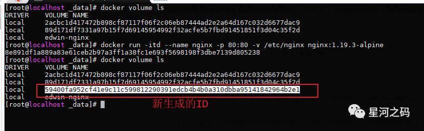 docker run -itd --name nginx -p 80:80 -v /etc/nginx nginx:1.19.3-alpine以上命令,没有宿主机目录位置,也没有起名字,只有一个容器的目录