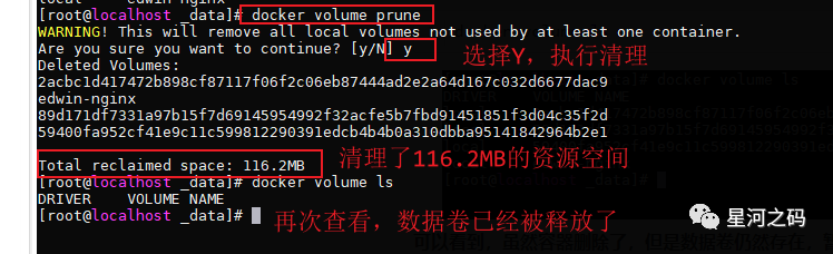 「可以看到,虽然容器删除了,但是数据卷仍然存在,暂用空间。可以通过prune命令清理」
