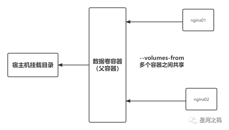 通过这个图可以看出来,数据卷容器就是介于容器和宿主机之间的一个容器,数据卷容器挂载到宿主机,其他容器跟数据卷容器进行挂载,从而到底多个容器数据共享的目的