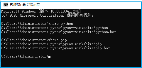 在测试 pyenv 是否生效时,可以通过 where python 或 where pip 检查 Path 中的优先级,检查 pyenv 的 shim 是否排在最前。