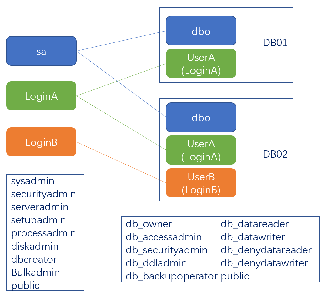 实例之间的账号如何迁移呢?在这前,我们首先要了解登录账号(Login)与数据库用户(User)之间有什么样的关系。这里我创建了2个数据库(DB01、DB02),创建了2个登录账号(LoginA、LoginB),创建了3个数据库用户,关联信息如下图。