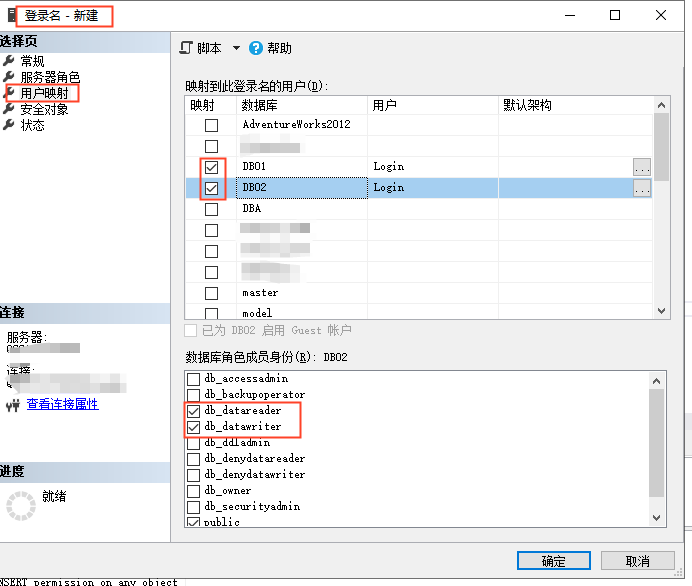 如上图,我们创建一个登录账号Login,该账号并未授予任何权限。2个数据库中也创建一个数据库用户User并关联Login,并把数据库角色 db_datareader、db_datawriter 分配给用户User。完成后,该登录账号只能访问 2个数据库,且只能对数据库进行 SELECT、INSERT、UPDATE、DELETE 操作。下图为SSMS管理工具的操作,创建账号同时创建数据库用户并授权。下图中,当我们勾选某个数据库的时,系统默认创建与登录账号同名的数据库用户,你也可以更改,但我们建议保持账号与用户名称一样。