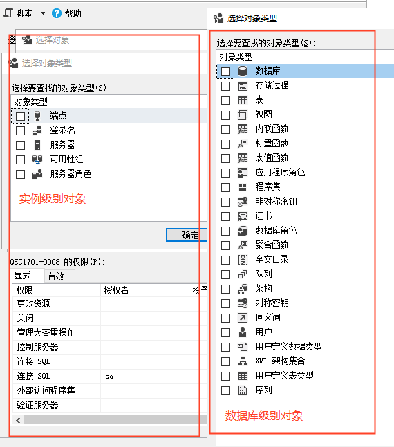 除了服务器角色或者数据库角色,你也可以自己创建相应的角色并分配权限。以上分配的都是角色,角色只是让我们更方便管理和分配权限,你还可以对更详细的对象进行权限分配。如下图,左侧为服务器对象及相关权限,可以对登录账号Login进行其他授权。右侧为数据库级别的对象,可以对数据库用户User进行单独授权(如只能对某张表进行查询)。