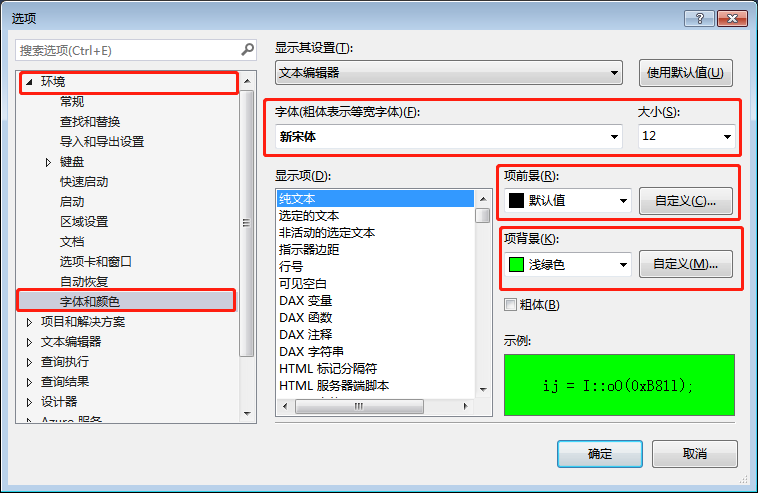 第四步:如果想改变SQL编辑器内的代码字体大小或编辑器背景主题颜色,可通过“环境”——>“字体和颜色”,然后查看右侧选项,进行设置,最后点击“确定”按钮即可。