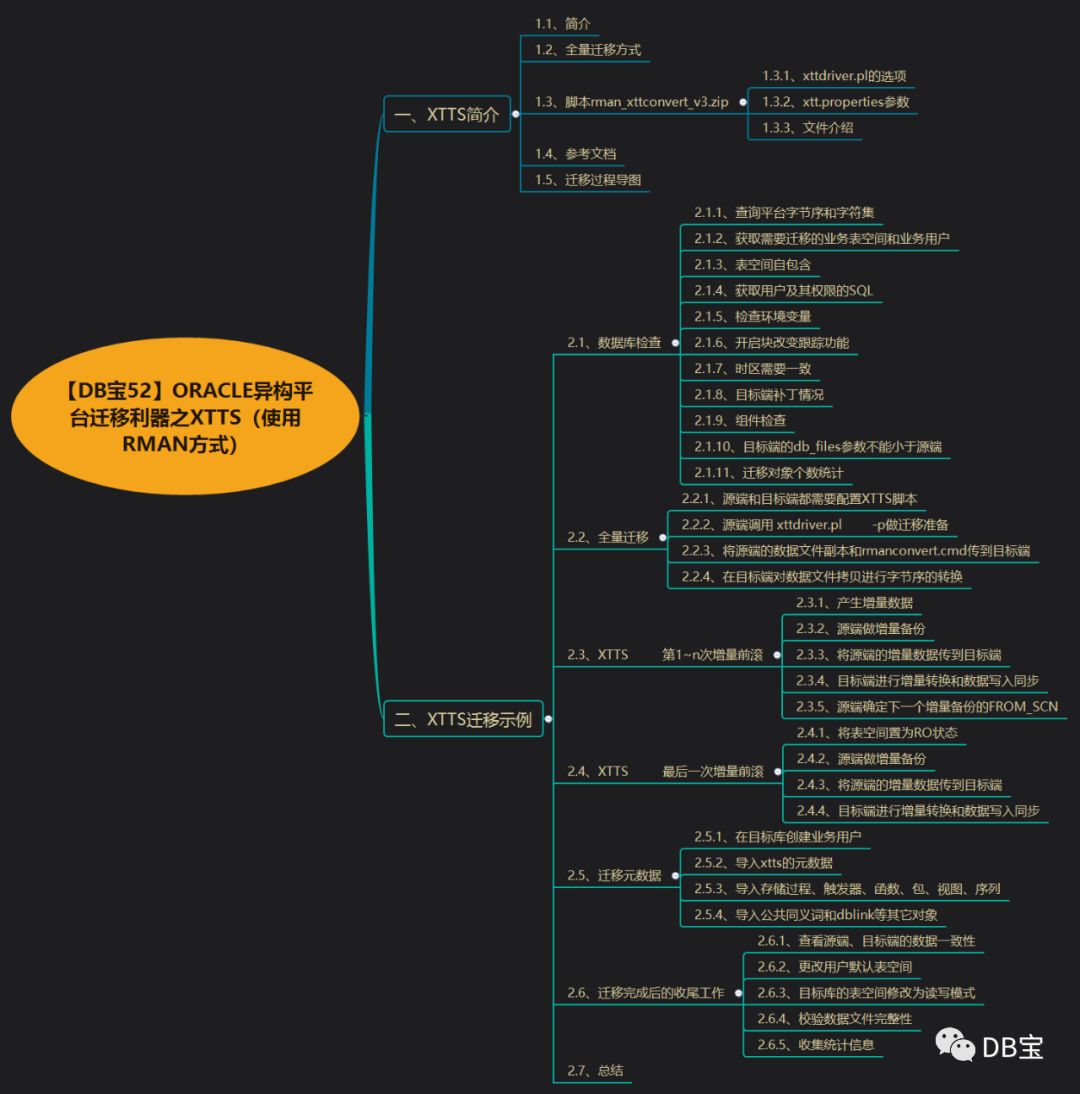 一、XTTS简介1.1、简介1.2、全量迁移方式1.3、脚本rman_xttconvert_v3.zip1.3.1、xttdriver.pl的选项1.3.2、xtt.properties参数1.3.3、文件介绍1.4、参考文档1.5、迁移过程导图二、XTTS迁移示例2.1、数据库检查2.1.1、查询平台字节序和字符集2.1.2、获取需要迁移的业务表空间和业务用户2.1.3、表空间自包含2.1.4、获取用户及其权限的SQL2.1.5、检查环境变量2.1.6、开启块改变跟踪功能2.1.7、时区需要一致2.1.8、目标端补丁情况2.1.9、组件检查2.1.10、目标端的db_files参数不能小于源端2.1.11、迁移对象个数统计2.2、全量迁移2.2.1、源端和目标端都需要配置XTTS脚本2.2.2、源端调用 xttdriver.pl -p做迁移准备2.2.3、将源端的数据文件副本和rmanconvert.cmd传到目标端2.2.4、在目标端对数据文件拷贝进行字节序的转换2.3、XTTS 第1~n次增量前滚2.3.1、产生增量数据2.3.2、源端做增量备份2.3.3、将源端的增量数据传到目标端2.3.4、目标端进行增量转换和数据写入同步2.3.5、源端确定下一个增量备份的FROM_SCN2.4、XTTS 最后一次增量前滚2.4.1、将表空间置为RO状态2.4.2、源端做增量备份2.4.3、将源端的增量数据传到目标端2.4.4、目标端进行增量转换和数据写入同步2.5、迁移元数据2.5.1、在目标库创建业务用户2.5.2、导入xtts的元数据2.5.3、导入存储过程、触发器、函数、包、视图、序列2.5.4、导入公共同义词和dblink等其它对象2.6、迁移完成后的收尾工作2.6.1、查看源端、目标端的数据一致性2.6.2、更改用户默认表空间2.6.3、目标库的表空间修改为读写模式2.6.4、校验数据文件完整性2.6.5、收集统计信息2.7、总结