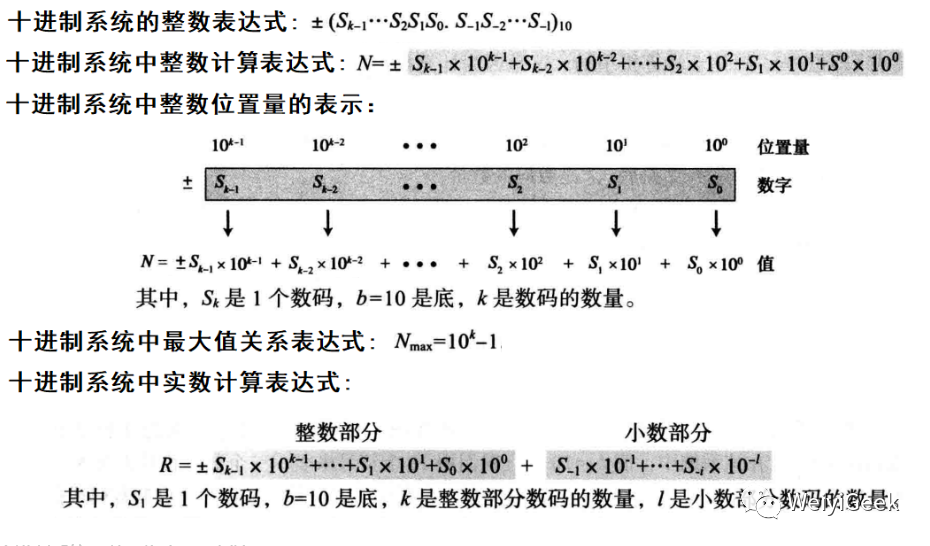 # 1.在十进制系统中,为了简便通常省略括号、底、以及正号(对于正数),例如 +(1024.1024)10, 写成 1024.1024 即可底号与加号是隐含的。# 2.位置量,例如在十进制系统中使用位置量表示整数 +256.位置量 10^2 10^1 10^0数字 2 5 6N =+ 2*10^2 + 5*10^1 + 6*10^0 (值为256)# 例如,在十进制系统中使用位置量表示整数 -1024.位置量 10^3 10^2 10^1 10^0数字 1 0 2 4N =- (1*10^3 + 0*10^2 + 2*10^1 + 4*10^0) (值为-1024)# 3.最大值,当k为数码数量为3时,其十进制系统整数最大值为 999Nmax = 10^3 - 1 = 999# 4.实数, 显示实数 +10.24 的位置量位置量 10^1 10^0 10^-1 10^-2数字 1 0 . 2 4N =- 1*10^1 + 0*10^0 . 2*10^-1 + 4*10^-2 (值为10.24)