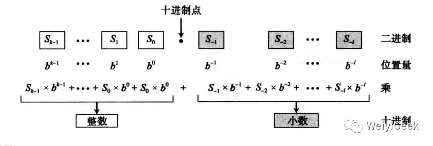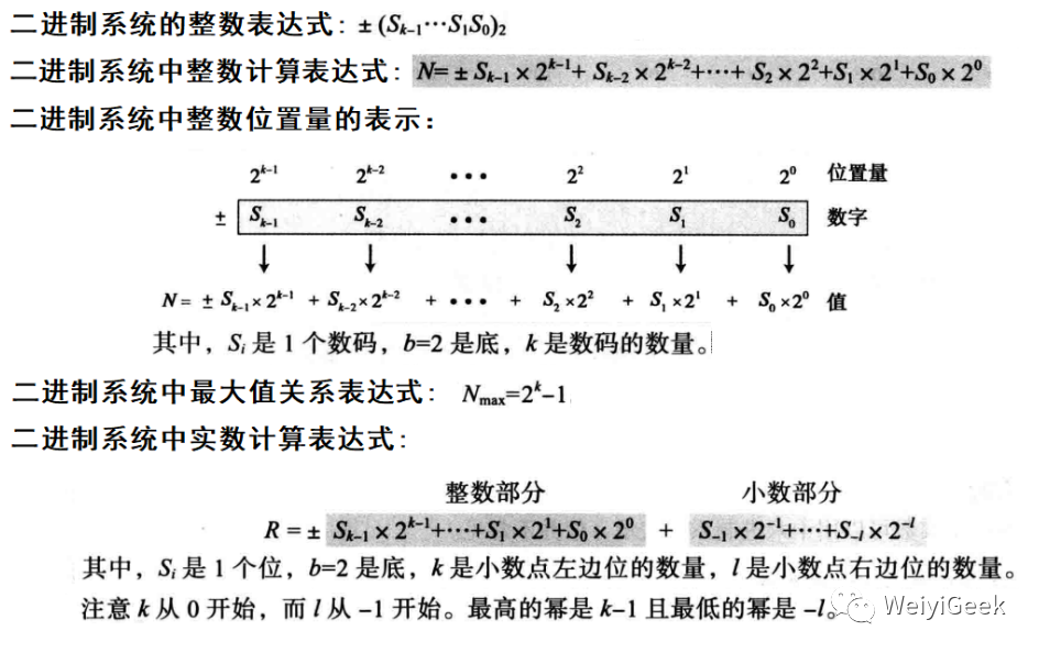 为了方便比较,此处再以计算机常用的二进制系统(以2为底)进行整数与实数进行讲解,可以如下图所示中得到计算的相关表达式,相比较于十进制只是将基数进行改变了,所以说八进制与十六进制的计算便不展开说明了。