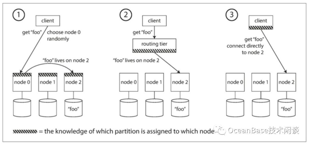 大部分分布式数据库架构,选择了第二种方案,有一个负责分区路由访问的模块。有些产品同时支持这三种方案。 针对分区路由问题情况还可能更复杂。如一个事务有多条SQL时该路由到哪个节点。此外就是如果负责路由的节点故障,或者分区所在节点故障,这个路由不可用或者失效时会如何恢复路由服务。