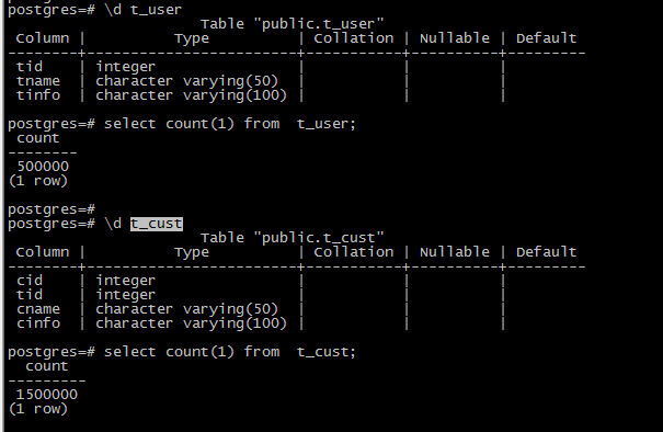 t_cust,cust表,以tid关联t_user表,并填充150万行数据信息.具体如下: