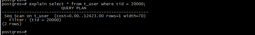 这里SeqScan on t_user即上文提及的扫描节点(ScanNode),代表着以全表扫描的方式访问t_user表。圆括号中cost单位毫秒,0.00代表这一步计划的启动开销。12423为这一步计划的总开销.rows为结果行数,width为平均行的字节数。