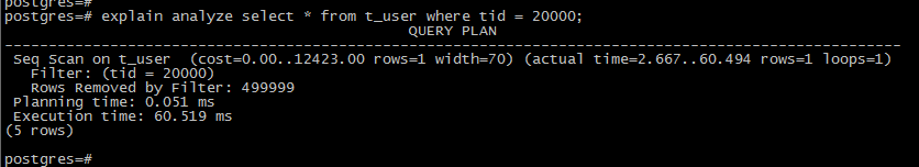 其中actual为实际耗时信息,以及最后输出的该语句的总时长。相较于总执行时长60.519ms的开销,主要都消耗在了扫描节点(60.494ms)上,且扫描节点下的Filter和RowsRemoved byFilter输出也提示基本上是99%的过滤性;这一步计划就可以发现存在优化空间,在tid字段上建立索引再来观察执行计划.如下: