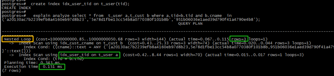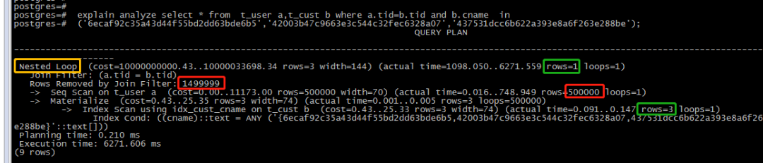 第二步:根据Nestedloop算法,使用步骤一的结果集(rows=3),以这3行结果集中的tid(JoinFilter)作为条件循环扫描t_user表3次(单次扫描处理500000行),最终NestedLoop过滤1499999行数据.返回1行结果集(rows=1)在这个计划中可以看到循环体内(Seq Scan on t_user a),扫描的结果集较大,且过滤性非常高,适合在该字段上创建索引。